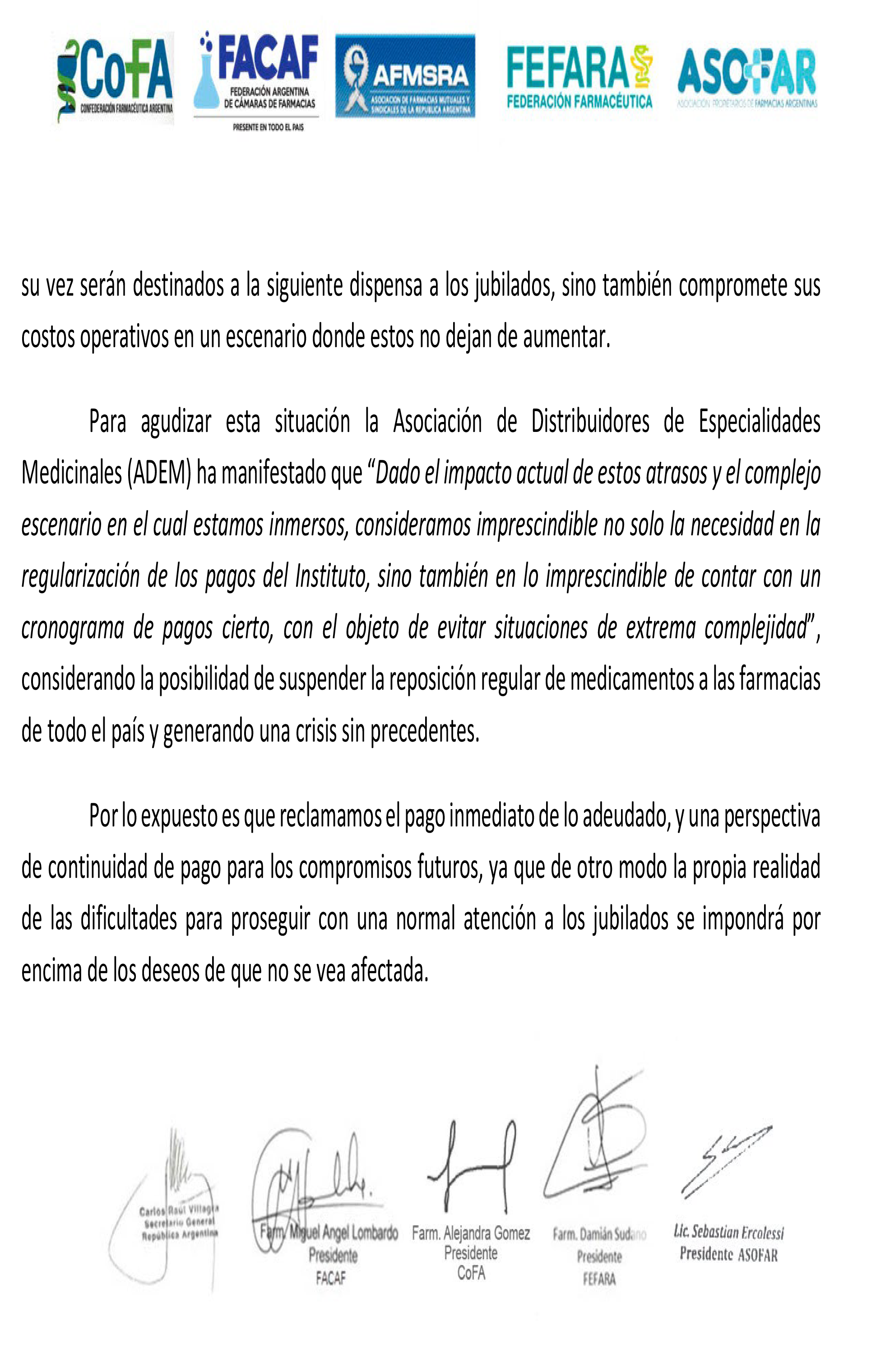 También las droguerías, representadas en ADEM, consideran no solo la necesidad de la regularización urgente de los pagos por parte del Instituto sino también la necesidad contar con un cronograma de pagos cierto, premisas en las coinciden las entidades farmacéuticas firmantes.