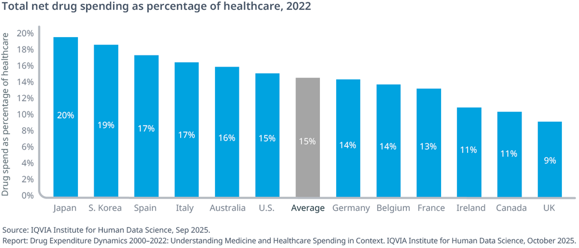 IQVIA concluye que los sistemas sanitarios son heterogéneos en su financiación y consumo. Por ejemplo, mientras la financiación privada de medicamentos es una parte importante del mercado estadounidense, en Reino Unido, los programas gubernamentales (NHS) constituyen la mayoría del gasto. Por ello, la consultora advierte que evaluar segmentos específicos de forma aislada no ofrece una comparación completa ni precisa del gasto.