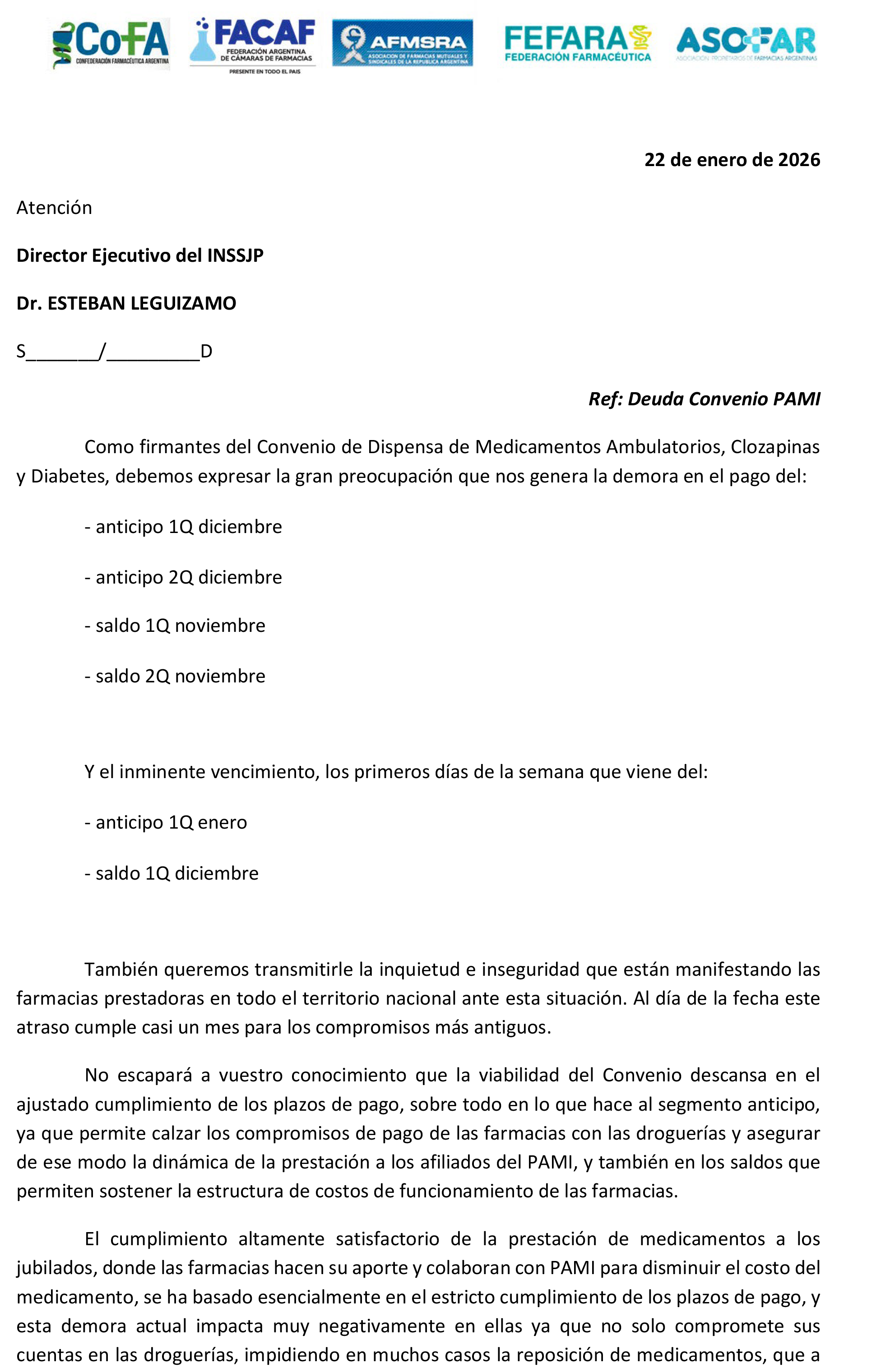 "Inquietud e inseguridad que expresan las farmacias de todo el territorio nacional" de esta manera comienza la carta que las principales entidades farmacéuticas, a saber, FEFARA, COFA, FACAF, ASOFAR y AFMSRA, le hicieron llegar a Esteban Leguizamo el Director Ejecutivo de PAMI debido a la demora en los pagos de varias quincenas a partir del mes de noviembre.