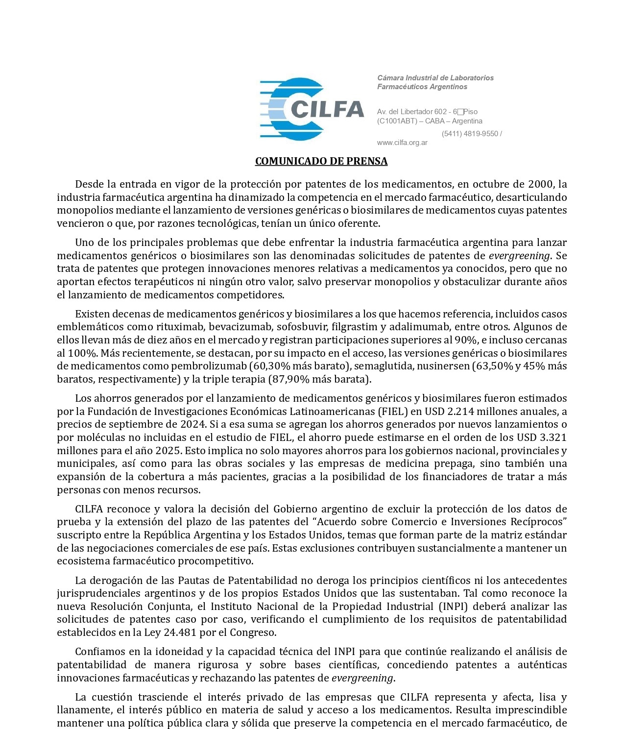 En este contexto, CILFA (Cámara Industrial de Laboratorios Farmacéuticos Argentinos) que agrupa a los laboratorios nacionales, fijó su posición, poniendo el foco en la importancia de preservar la competencia en el mercado y evitar prácticas que extiendan artificialmente los monopolios.