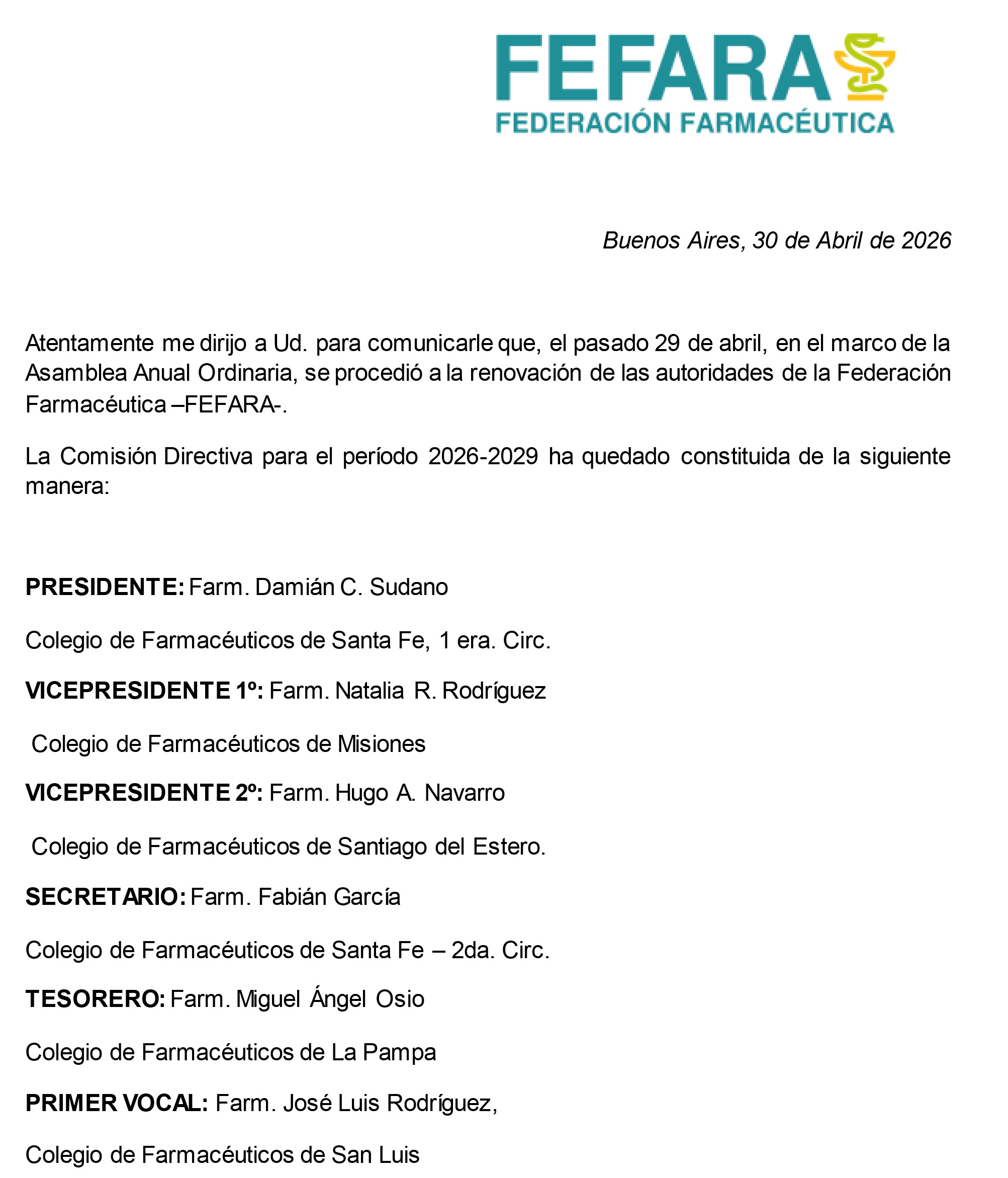 Tras la Asamblea Anual Ordinaria celebrada el pasado 29 de abril, la Federación Farmacéutica de la República Argentina (FEFARA) definió su conducción para el período 2026-2029. La entidad ratificó la continuidad de su presidente, Damián Sudano, quien encabezará la Comisión Directiva durante este nuevo ciclo institucional.