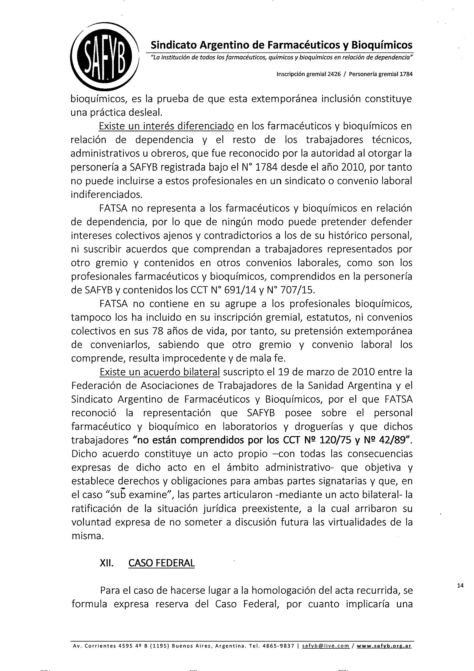 Peretta señaló que FATSA suscribió un acuerdo paritario que “en forma irregular incluyó al ‘Personal con título universitario’ de farmacéutico y bioquímico, siendo que está agrupado y representado desde 2006 por otro gremio: el Sindicato Argentino de Farmacéuticos y Bioquímicos – SAFYB”.